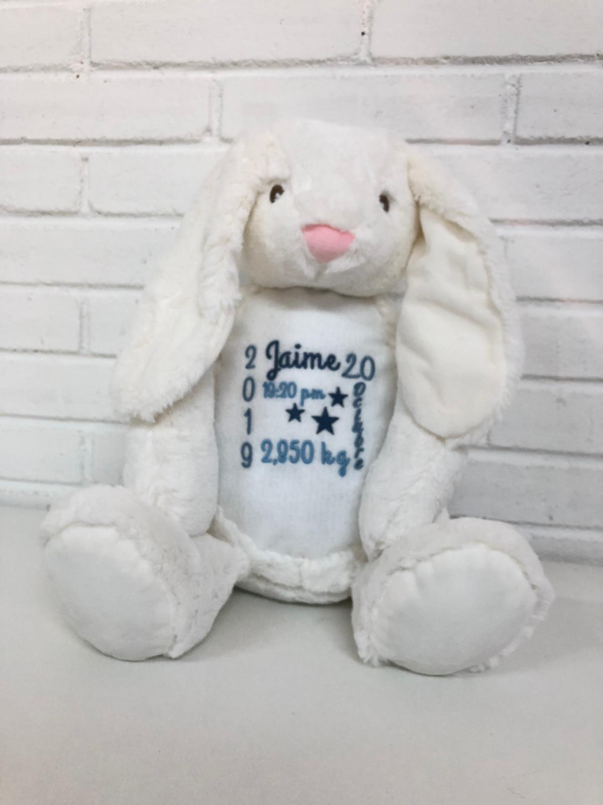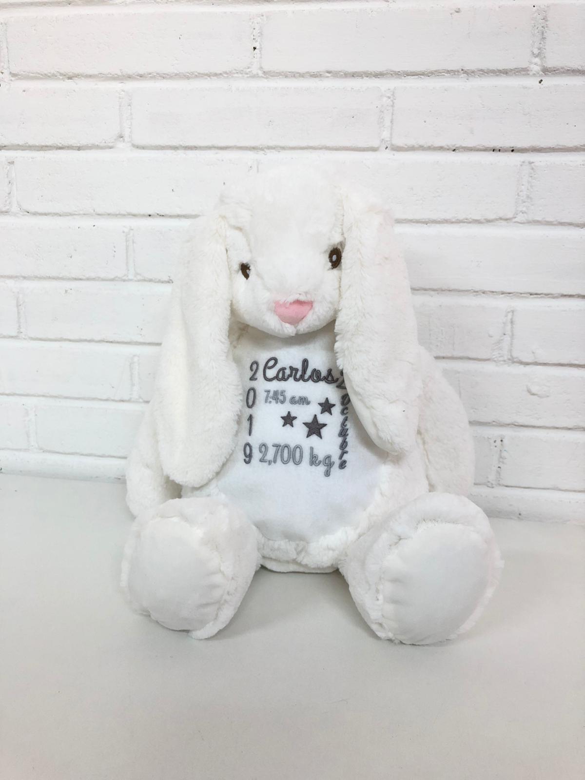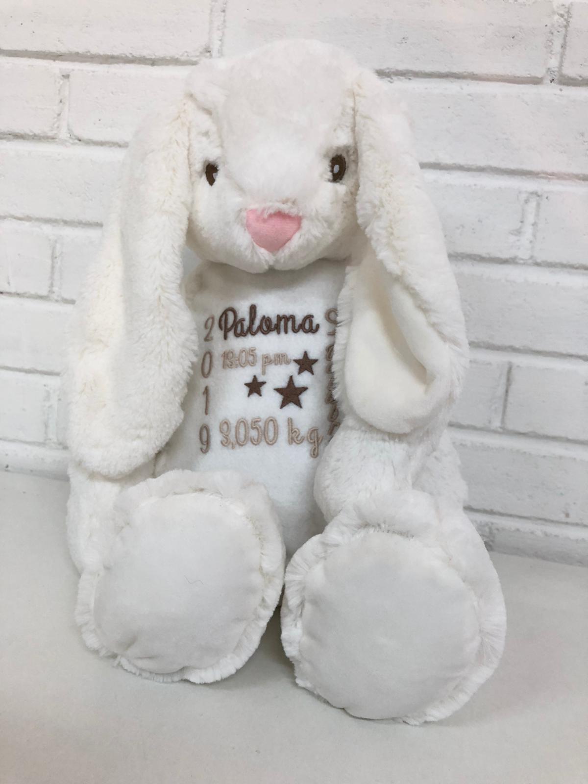 Conejo de peluche personalizado con el nombre y datos de nacimiento (fecha, hora y peso).