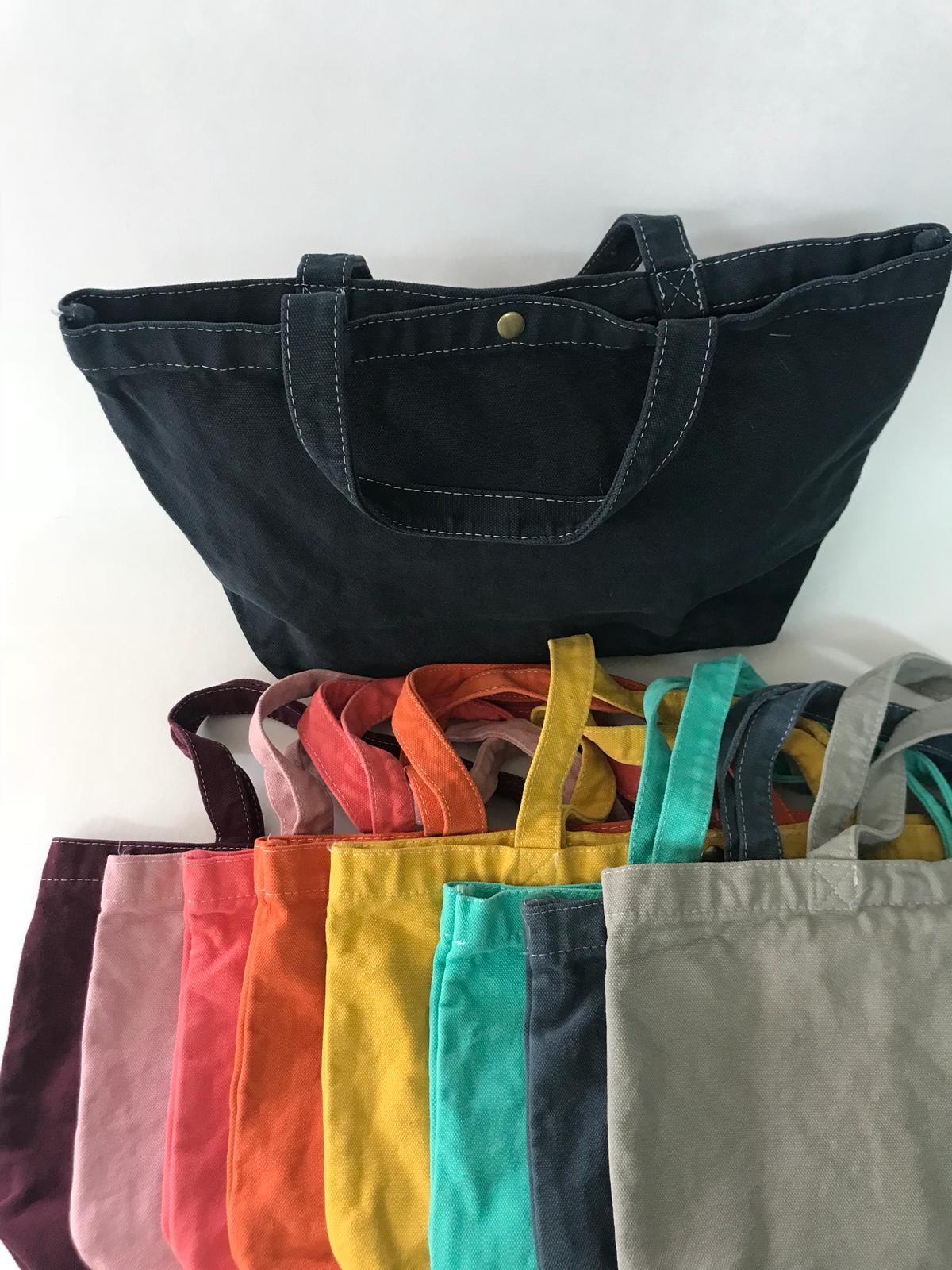 Bolso 100% algodón lienzo teñido y lavado (cada pieza es única) con asa de 36cm y cierre de botón a presión color bronce.