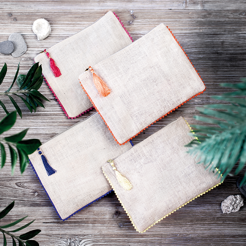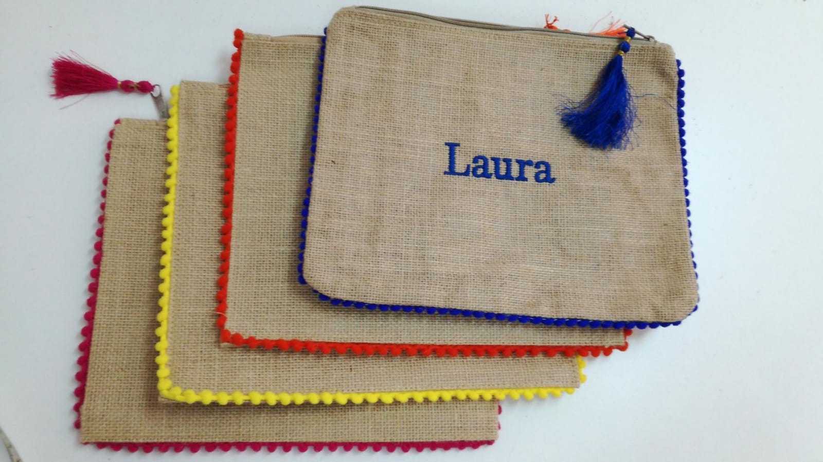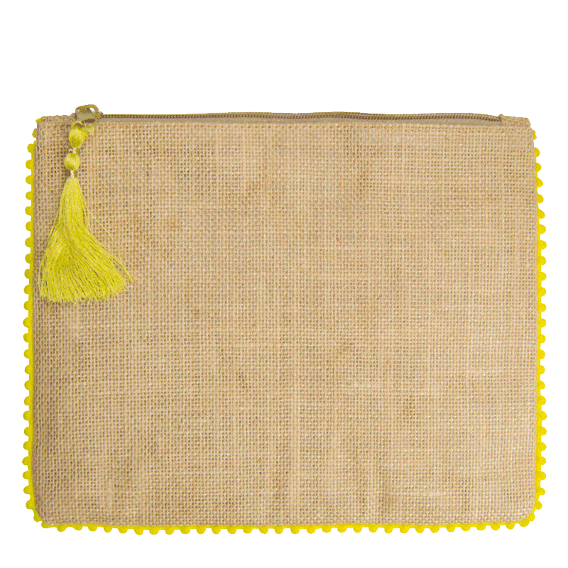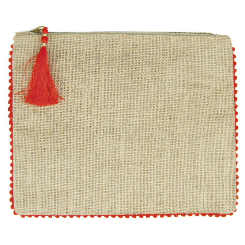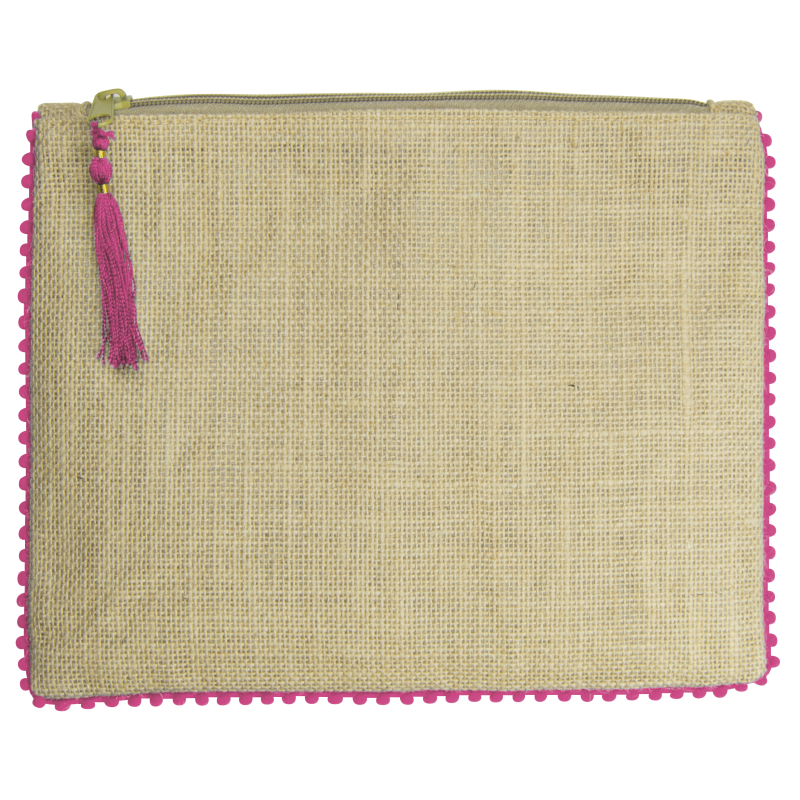 Neceser fabricado en jute con laminado en su interior. Detalle alrededor y tirador con pompón en distintos colores.