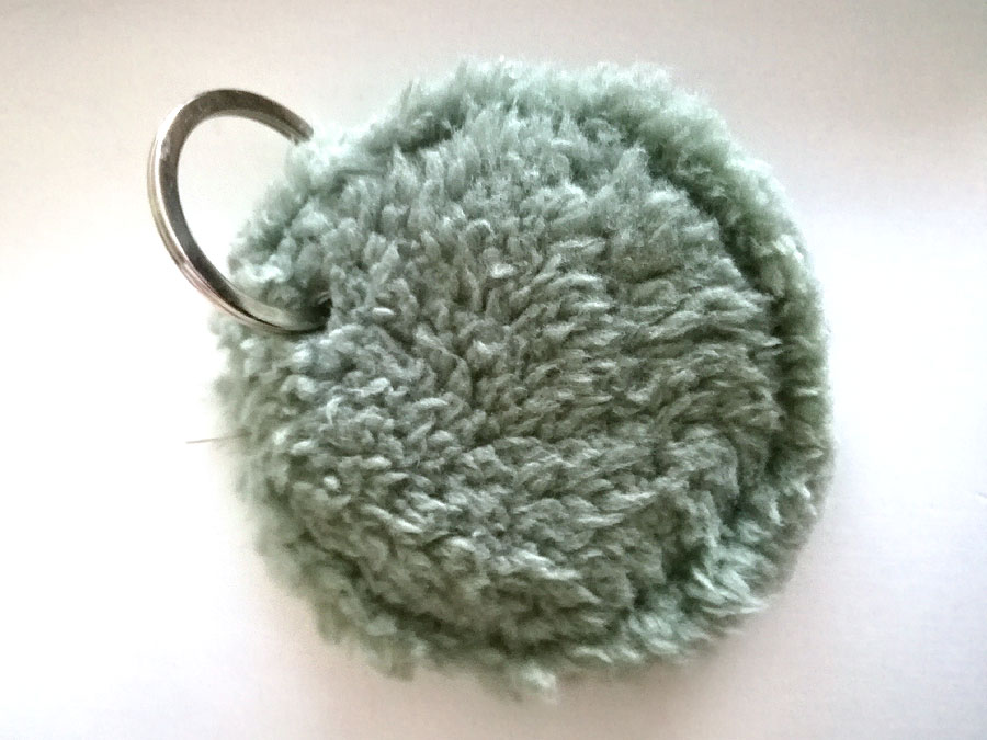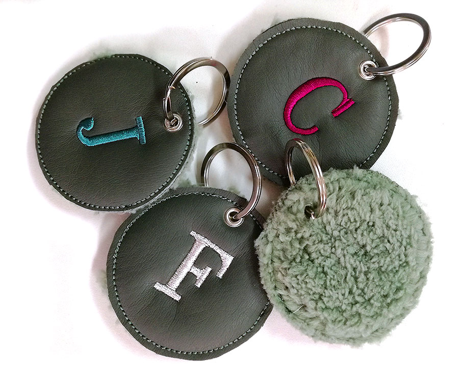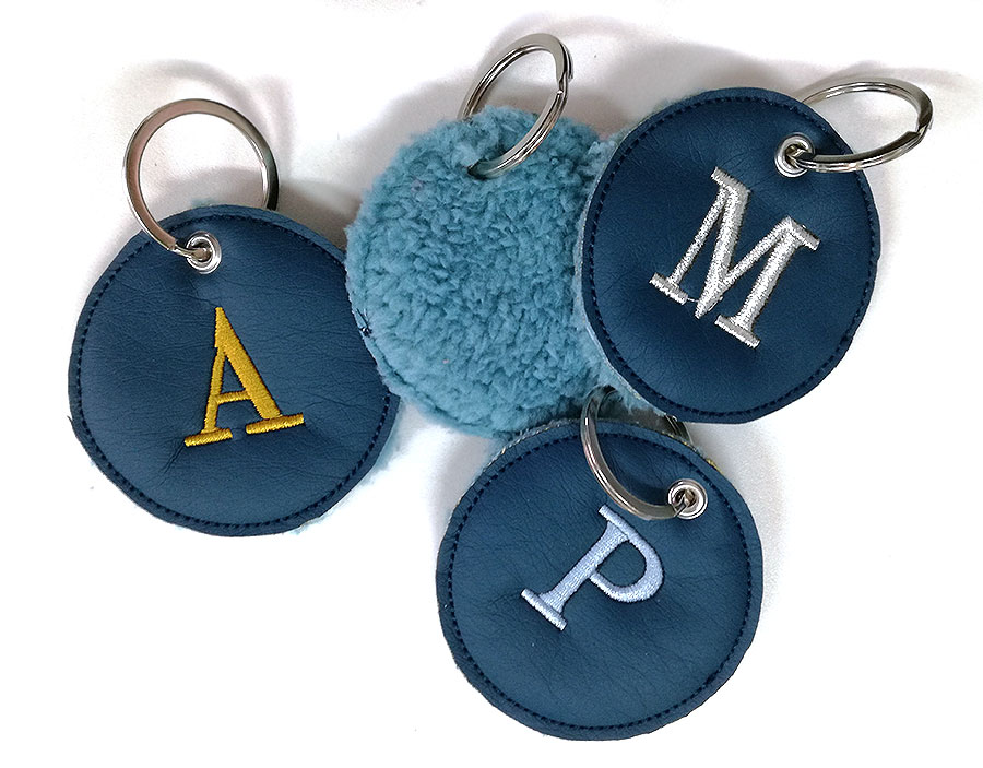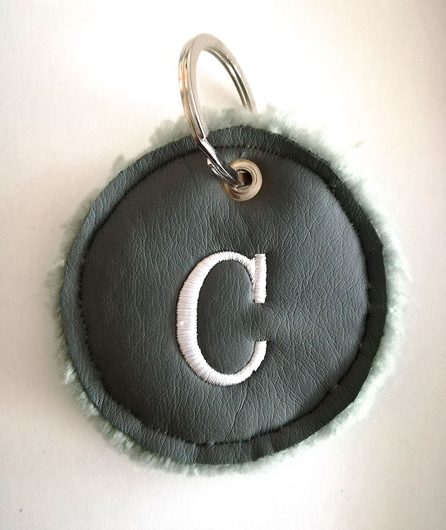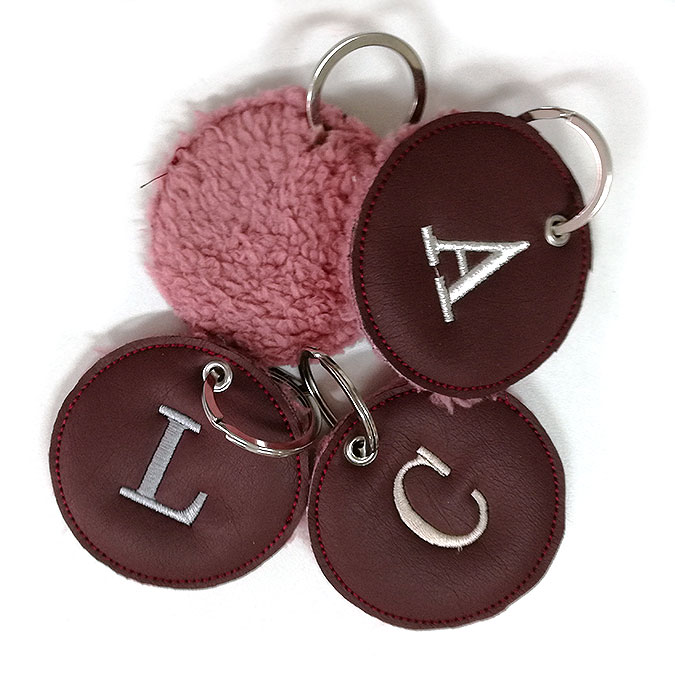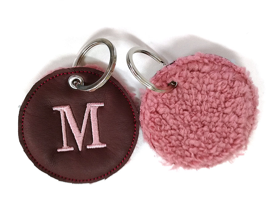 Llavero forma círculo con dos caras, polipiel y borrego a tono, con inicial bordada y anilla plateada.